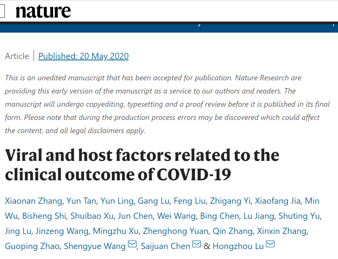 2020年5月20日,上海公共卫生临床中心卢洪洲教授、上海交通大学医学院附属瑞金医院陈赛娟院士、Wang Shengyue等人在 Nature 在线发表题为:Viral and host factors related to the clinical outcome of COVID-19 的研究论文。