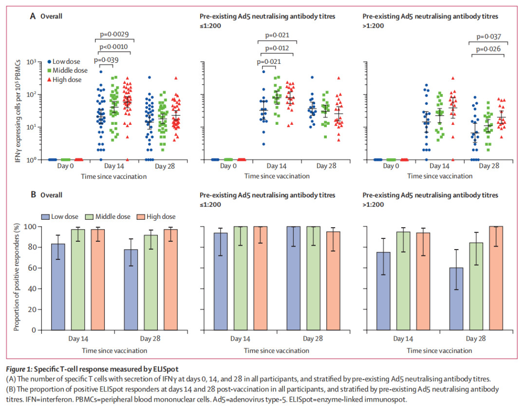 这是世界第一个新冠疫苗人体临床数据,此项研究是在108名健康成年人中进行的开放标签试验,对以腺病毒Ad5为载体的新冠疫苗进行评估:在接种疫苗后的第14天开始就发现了快速的特异性T细胞反应,并在第28天对SARS-CoV-2的体液免疫反应达到高峰,且未发现严重不良事件。