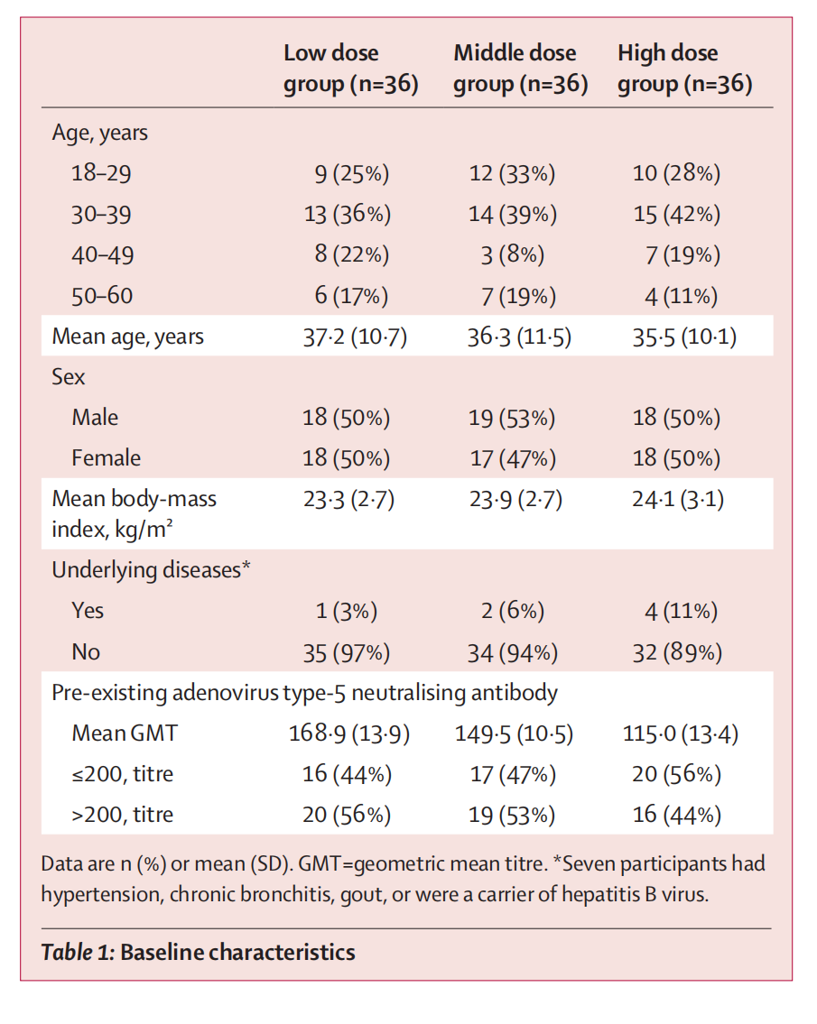 在2020年3月16日至3月27日期间,研究小组筛选了195名志愿者,其中108人(51%为男性,49%为女性;平均年龄36.3岁)被招募并被分配到三个剂量组——低剂量组(5 x 1010)、中剂量组(1 x 1011)以及高剂量组(1.5 x 1011)。
