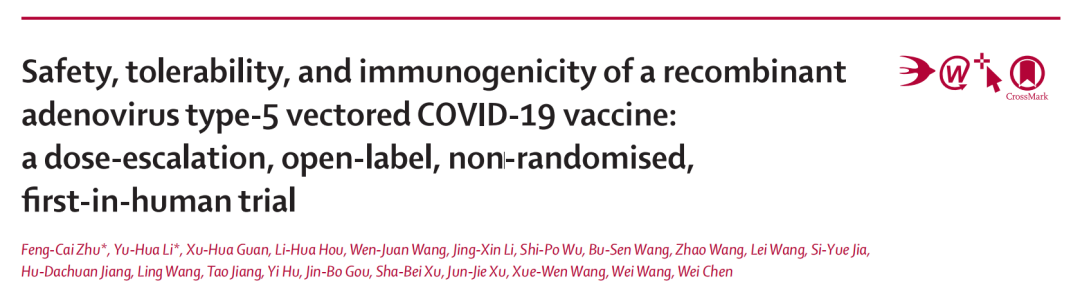 北京时间5月21日晚9点,陈薇院士团队、江苏省疾控中心朱凤才教授团队在国际顶级医学期刊《柳叶刀》(Lancet)上线题为:Safety, tolerability, and immunogenicity of a recombinant adenovirus type-5 vectored COVID-19 vaccine: a dose-escalation, open-label, non-randomised, first-in-human trial 的新冠疫苗临床研究论文。