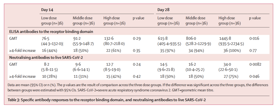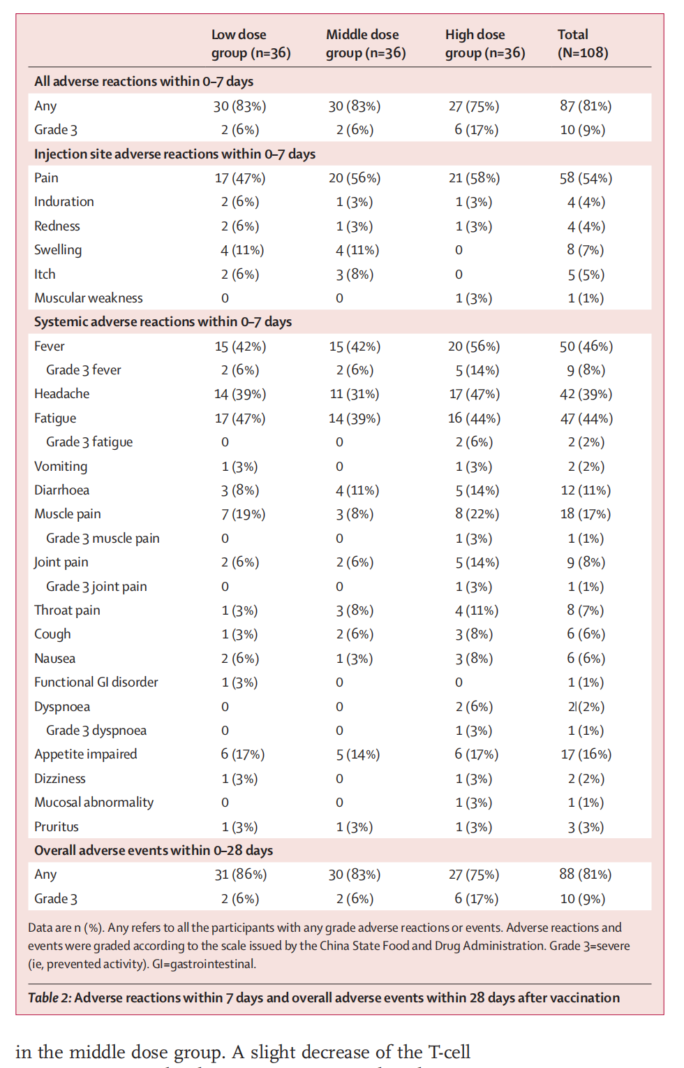 所有剂量组报告的大多数不良反应的严重程度为轻度或中度,并且接种后28天内未发现严重不良事件。ELISA抗体和中和抗体在第14天显著增加,并在接种后28天达到高峰(体液免疫);特异性T细胞应答在接种后第14天达到高峰(细胞免疫)。