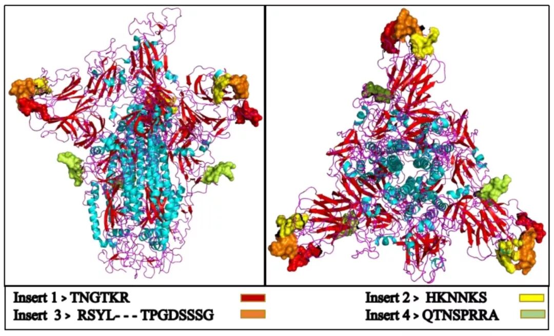 研究人员称,他们在新冠病毒的S蛋白(刺突蛋白)中发现了4个插入片段,这4个片段是新冠病毒(2019-nCoV)所独有的,其他冠状病毒中没有这些插入片段。