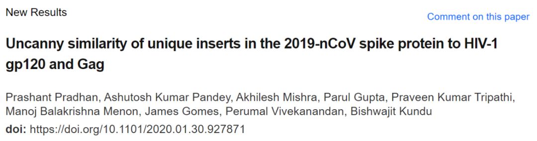 1月31日,印度理工学院德里分校的研究人员在生物预印本 BioRxiv 发表题为:Uncanny similarity of unique inserts in the 2019-nCoV spike protein to HIV-1 gp120 and Gag 的文章。