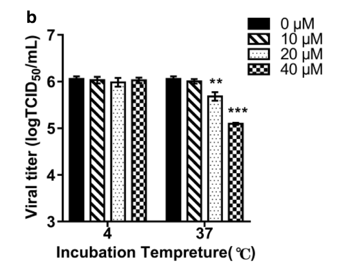 时间曲线测定显示姜黄素主要作用于TGEV复制的早期,值得注意的是,在吸附试验中,姜黄素在40μM时可以使病毒滴度降低为3.55 log TCID50 ml-1,这表明姜黄素对TGEV的吸附有很好的抑制作用。