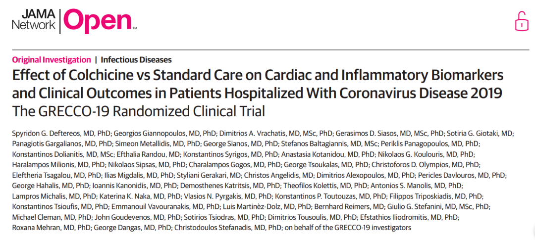 近日,JAMA Network Open 杂志发布了题为:Effect of Colchicine vs Standard Care on Cardiac and Inflammatory Biomarkers and Clinical Outcomes in Patients Hospitalized With Coronavirus Disease 2019 The GRECCO-19 Randomized Clinical Trial 的临床试验研究论文。