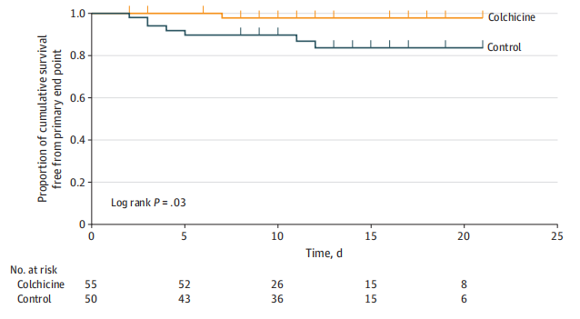 对照组和秋水仙碱组10天累积无事件生存率分别为83%和97%(P=0.03)。对照组出现终点事件的7例患者中,1例(14.3%)需要无创性机械通气(BiPAP),5例(71.4%)插管机械通气(3例在插管后不久死亡),1例(14.3%)在抢救室猝死。秋水仙碱组1位出现终点事件的患者接受了有创性机械通气,随后在ICU死亡。
