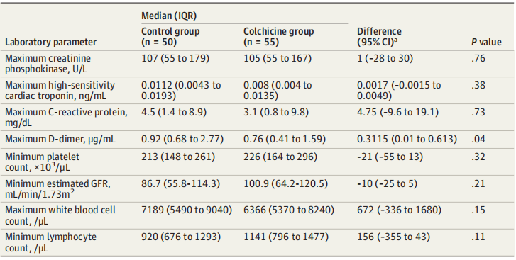 在反映预后的生化标志物中,仅D-二聚体一项存在组间差异。适用秋水仙碱对心肌损伤标志物高敏心肌肌钙蛋白(hs-cTn)并无显著影响。