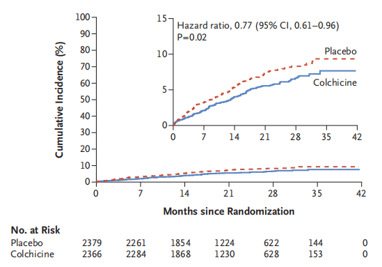 2019年新英格兰医学期刊(NEJM)的一篇RCT表明,对心肌梗死后的患者,给予秋水仙碱具有预防心血管事件的作用。