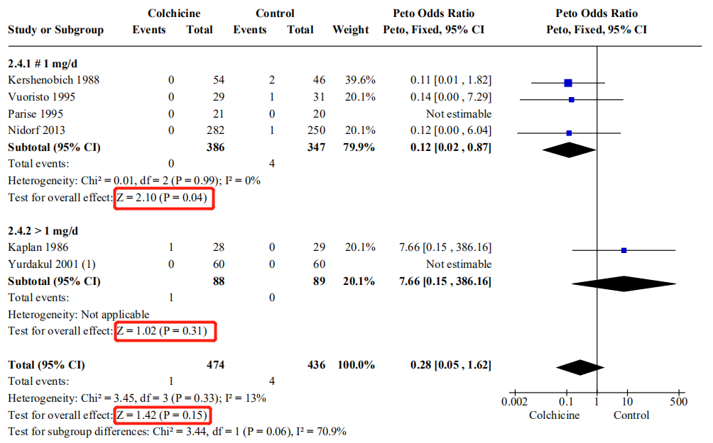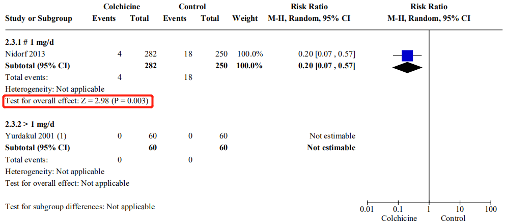 Cochrane Library 2016年发表的系统评价也支持秋水仙碱能在一定程度上减少心血管死亡率,肯定了秋水仙碱在预防心肌梗死中的作用,尽管其对预防心衰和脑卒中无效。