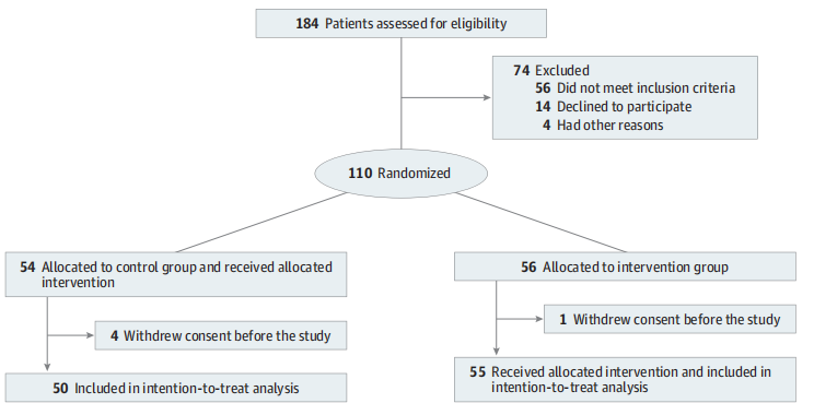 共纳入105位受试者,两组在基础疾病、病情严重程度和常规药物治疗方面没有显著差异。研究的主要结局指标(终点事件)是7级量表划分的病情恶化超过两级。
