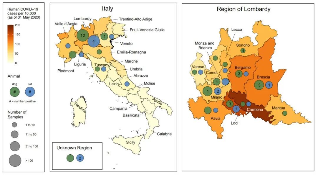 研究人员在意大利北部地区(主要为伦巴第地区)采集了817只宠物的样本,发现其中3.4%的狗和3.9%的猫具有可检测的新冠病毒中和抗体滴度。更值得注意的是,新冠确诊患者的宠物猫和宠物狗被检测出抗体阳性的概率更高。