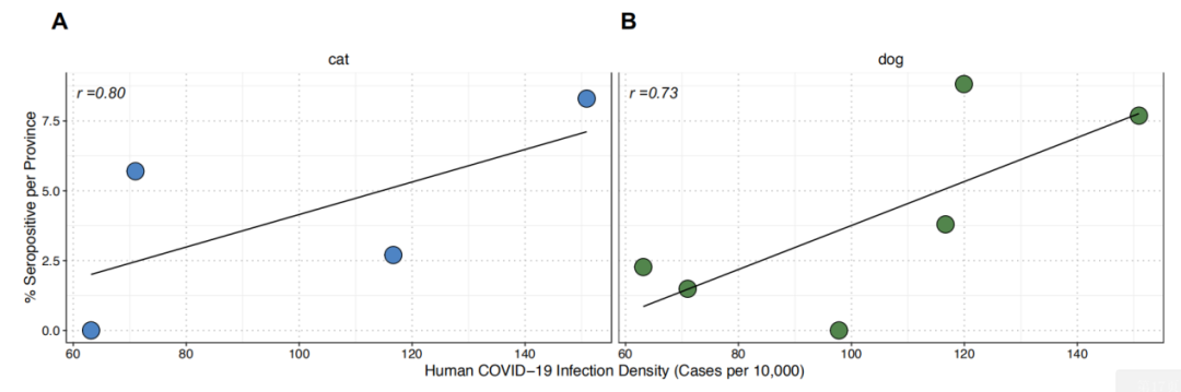 与此同时,对于那些生活在具有新冠确诊患者的家庭的宠物,47只狗中有6只(12.8%)抗体检测为阳性,22只猫中有1只(4.5%)抗体检测为阳性。