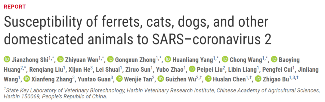 早在今年4月份,中国农业科学院哈尔滨兽医研究所陈化兰院士团队等在预印本平台bioRxiv上发表的一篇关于易感动物筛查的研究论文——Susceptibility of ferrets, cats, dogs, and different domestic animals to SARS-coronavirus-2。
