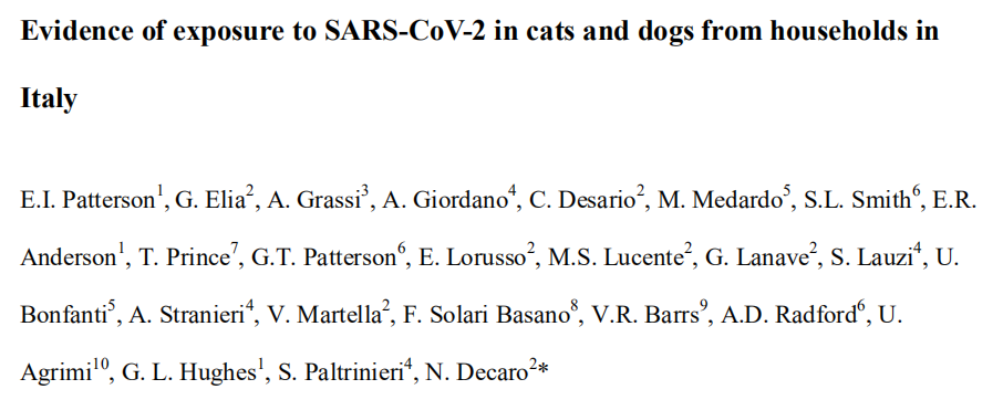 近日,英国利物浦热带医学院、意大利巴里大学等研究机构在 bioRxiv 上联合发表了题为:Evidence of exposure to SARS-CoV-2 in cats and dogs from households in Italy 的研究论文。