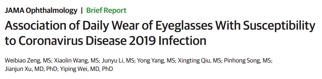 近日,南昌大学第二附属医院魏益平等人在 JAMA 子刊 JAMA Ophthalmology 杂志发表了题为:Association of Daily Wear of Eyeglasses With Susceptibility to Coronavirus Disease 2019 Infection 的文章。
