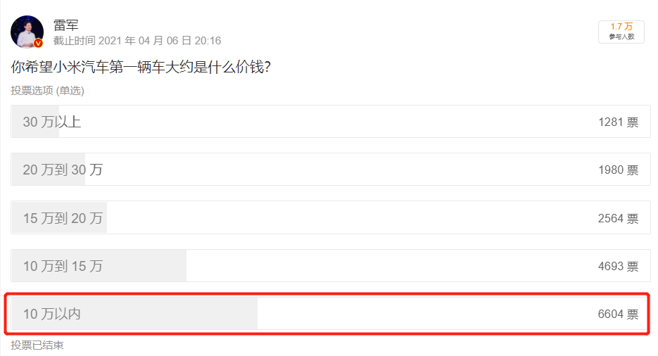 雷总前段时间就在微博上搞过投票,票选米粉希望的小米汽车价格,结果不出所料,10 万以内是最多人选的,其次是 10 到 15 万元。