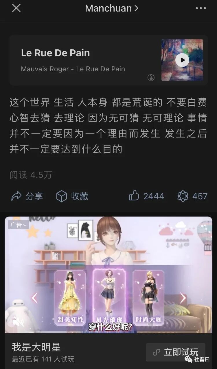 这个玩法的开创者,应该就是Manchuan,大家感兴趣的话,可以去看下公众号,每天几十个字的文章,阅读好几万,可想而知它通过抖音获得了多少粉丝到公号里。