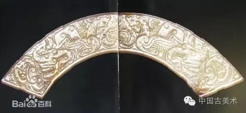 璜体上下两侧和两端皆减缘形成牙槽,而中部较大部分减缘则与一般玉璜不同。玉璜两面纹饰相同,毎面以穿孔为中心,中间为一兽面纹,两侧各雕一龙,龙首一侧为凤喙,龙身旁布满凤羽。龙身外各雕4条相互虬曲蟠绕之龙。整件玉璜全部采用浅浮雕,两面共雕饰20条龙、4只凤鸟和2个兽面,即使穿系孔的周边亦浮雕出圆廓,不留空白,虽构图饱满,却密而不塞,给人以龙凤呈祥之感。构图奇妙,工艺精湛,令人叫绝。