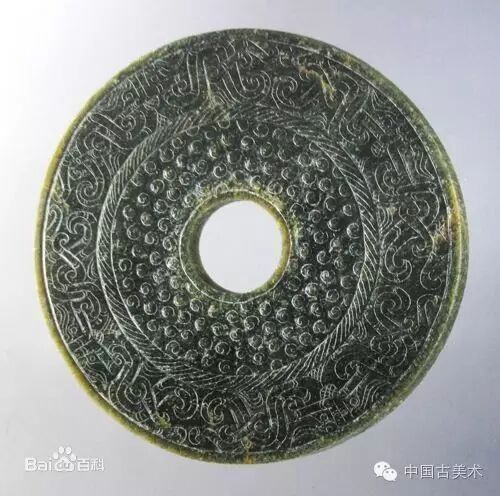 直径22.5厘米,青玉制成。璧面纹饰以同心圆绳纹分为内外两区,内区为涡纹,外区为四组变形夔龙纹。龙纹结构奇特,龙头雕出额头及鼻梁,嘴不明显,鼻下部两侧各有两条粗阴线,两个飘带状角向两侧延伸,将龙身缠绕。根据该玉璧的尺寸和质地推测,应属殓玉。