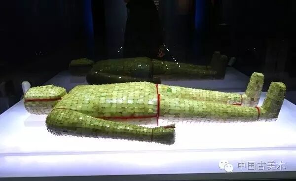 修复后的金缕玉衣陈列在徐州博物馆展厅最显眼的位置。玉衣由上等和田白玉制成,温润晶莹。玉片有正方形、长方形、三角形、半圆形、月牙形等形状,最大的鞋底片近9平方厘米,最小的手套片不到1平方厘米,有的厚度还不到1毫米。玉片的表面抛光光洁度很高,打孔工艺也很规范。目前国内修复完整的玉衣有7件,一件玉衣由2000余片玉片拼缀而成,而这件玉衣用了4248片玉片,穿缀的金丝重近1576克,是目前国内出土玉衣中年代最早、玉片最多、玉质最好、工艺最精美的一件。修复后的金缕玉衣,长1.74米,从头到脚连成一体,非常像古代的盔甲。由于玉片与金丝的长期接触,有些玉片已泛黄色,而有些玉片在散落后落到铜器上,所以就呈现出明显的翠绿色。