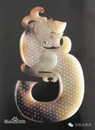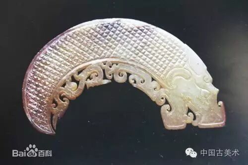 玉冲牙形似玉觿但较粗钝。此件玉冲牙作龙形。龙身饰勾连谷纹,内侧有透雕的龙凤卷云纹附饰,构思新颖,纹饰流畅.