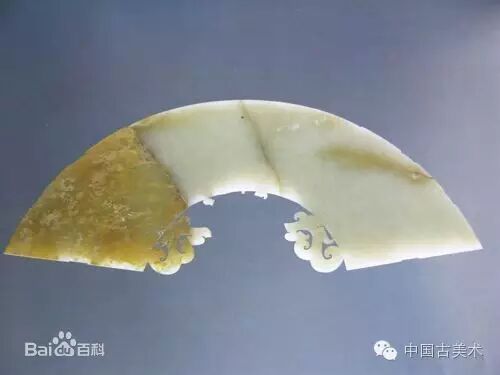 玉璜出土于甬道中,发现时碎成3块,已经粘合。玉璜以名贵的和田玉琢成,质地坚硬,细腻温润。器身磨光,素面,外缘和两侧边皆有减缘形成的牙槽,内缘有连续的透雕纹样,可惜部分纹样已残失。从残余纹样造型看,原来雕琢的可能是龙凤纹。玉璜正中顶部钻有配挂用的小孔。该器是目前已知体量最大的玉璜,质量上乘,但给人以未完工的感觉,可能是一件半成品,璜体尚未及雕琢纹饰就随葬于楚王墓中。