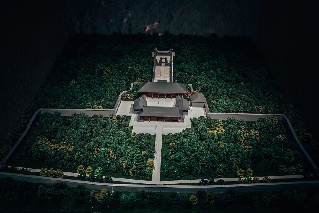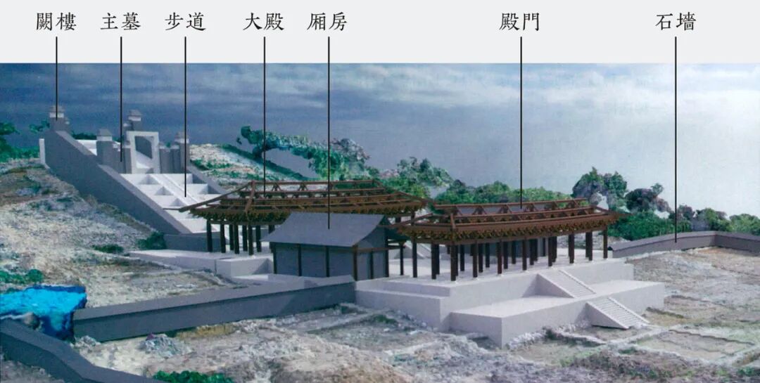 兰若寺大墓还有一个极显著的特点,就是“轻视对地下墓穴的布置,重视对地上建筑的营建。”从现场展板资料中可以看出,大墓墓穴部分较小,几乎仅能放下一座棺木,但在墓穴南侧的中轴线上却安排了多处体量巨大的建筑。其中殿门和大殿达到了七开间。