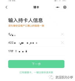 ①输入领卡人真实的姓名、身份证号、手机号(学生监护人联系方式),点击【下一步】