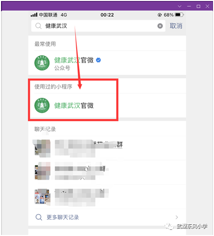 第一步:微信搜索“健康武汉”小程序。