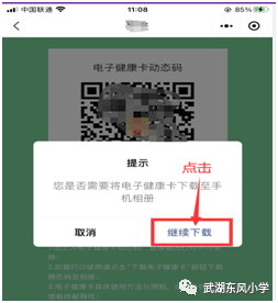 ②点击后进入电子健康卡静态码下载页面(上),在此页面点击【下载电子健康卡】,会出现下面页面,点击【继续下载】,系统会自动将电子健康卡静态码下载到手机相册。