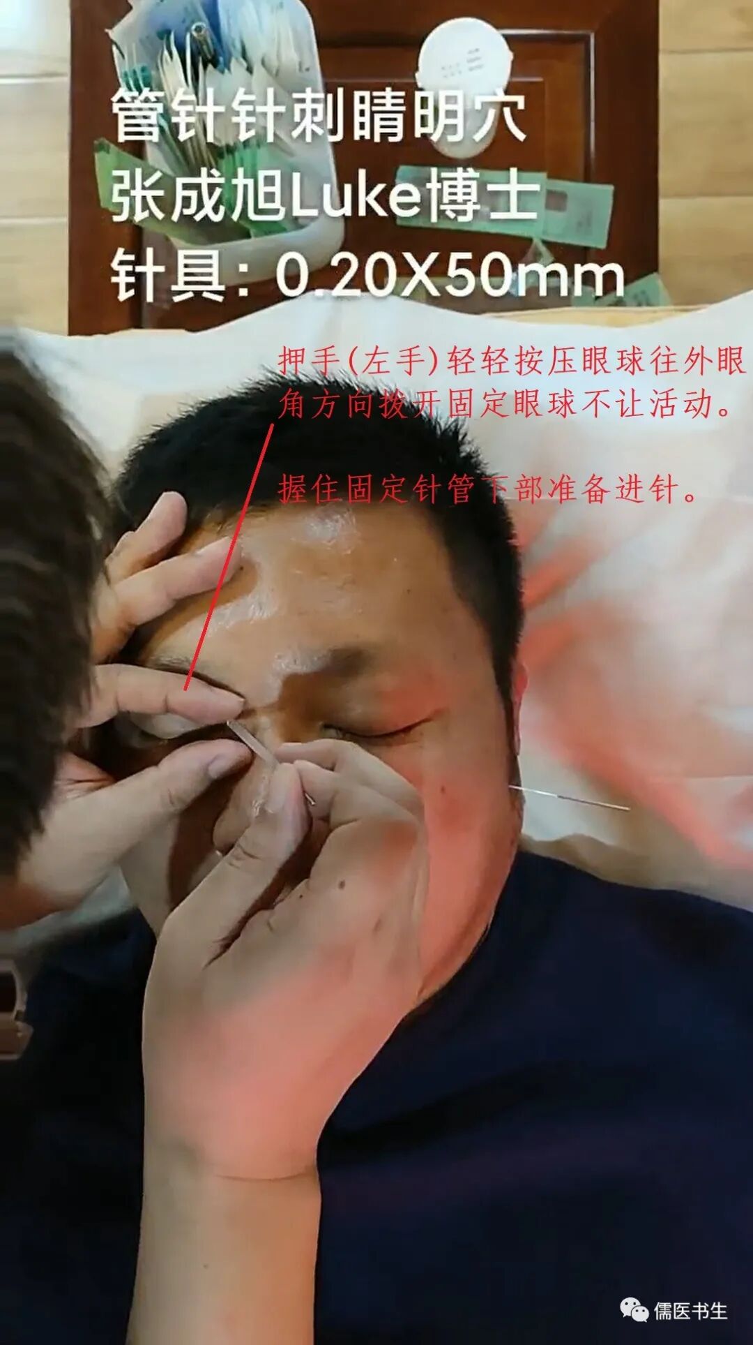 以此类推左侧睛明穴针刺方法,押手(右手)轻轻按压眼球往外眼角方向拨开固定眼球不让活动。