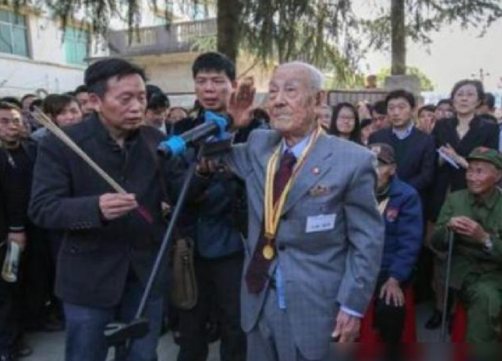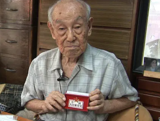 老者虽然年龄很大,但神志清晰,在他的胸前,一枚“中国人民解放军”的徽章和抗战胜利70周年的纪念章显得格外亮眼。