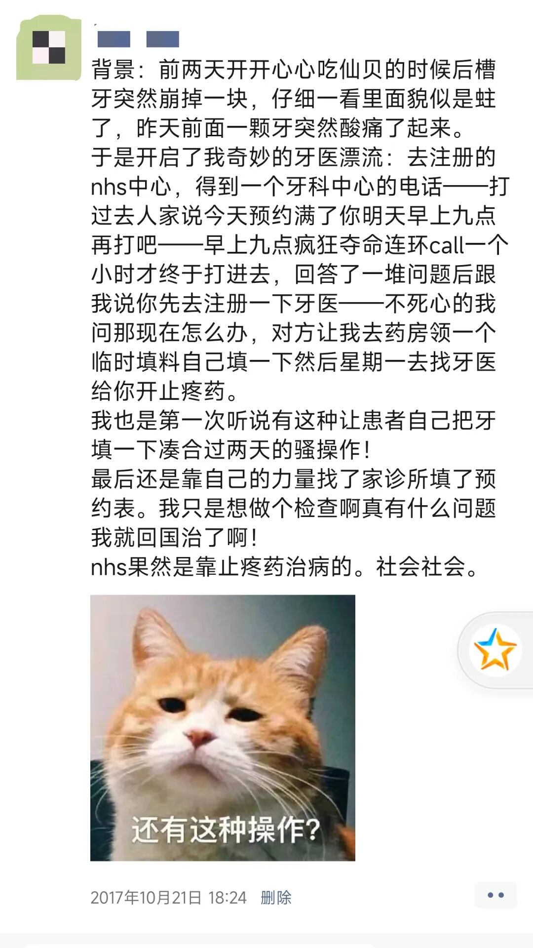 后续:国内五分钟挂上了号,牙医看了一眼说:“你这个补牙倒是不急,但是边上的智齿长出来了呀。”说时迟那时快,在我发出代表质疑的“啊”之后,温柔的牙医阿姨一手按头一手持钳,略施寸劲就完成了豚口拔牙的操作,整个过程不超过一分钟。以至于我嘴里塞着止血的棉花走出诊室的时候,陪同的朋友大为纳闷:“你补个牙怎么五分钟都没有就搞定了?”