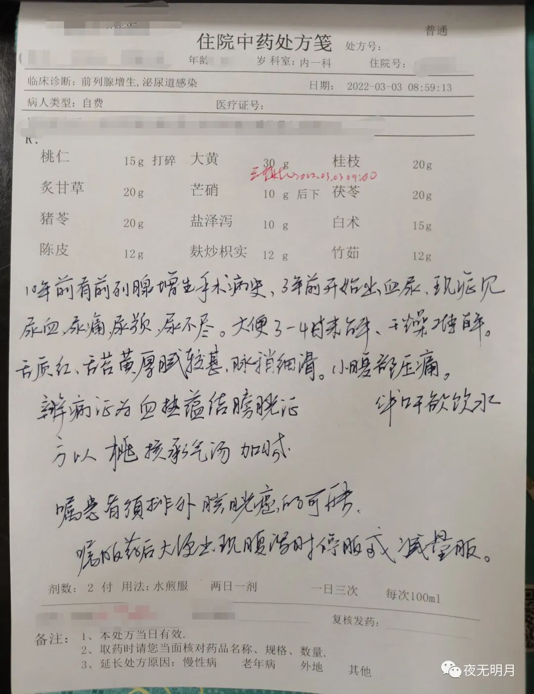 下班后心中还想着这个病人,生怕今晚吃了药以后严重腹泻。为了预防严重腹泻出现,我反复交待病人服药后看大便情况,如果出现腹泻,哪怕是轻微的就先别服用,告诉我,我再定夺。 第二天,我一早就跑去看他,生怕有个啥。 病人诉昨日已经服药两次,并且解了一次大便,干燥的大便,量不是很多,并没有出现腹泻的情况哟。啊,这下放心了,更难能可贵的是今天小便里没有见到出血的情况了。让他继续服用吧。我内心的石头是安稳地放下来的。只是要对症的30克大黄也没事。 可别盲目,病人真的不是阿狗阿猫,严格辩证,抓准机会再出手。 ………… 啊,我去,忘了看他舌苔如何了,我这叫啥,叫那啥来着……得意忘形?还是欣喜障目?唉,稳重一点,再稳重一点。