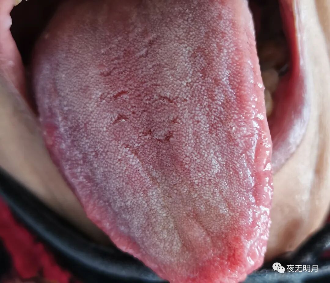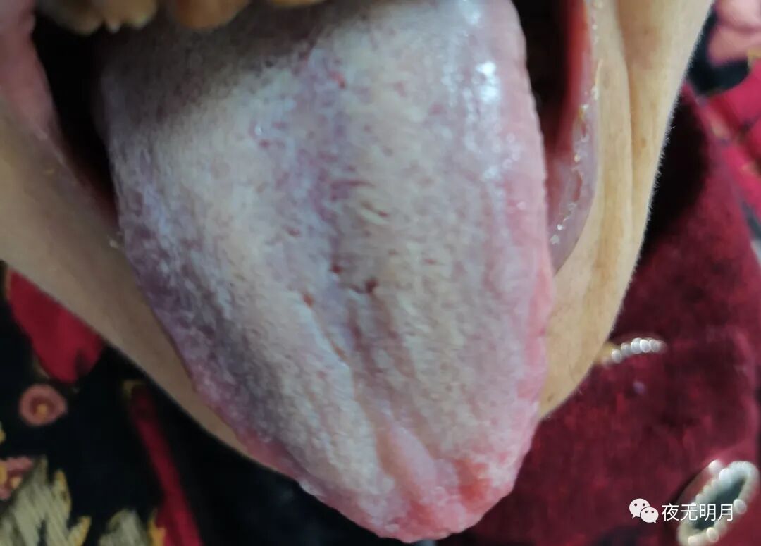 (2022-04-13晨查房舌像)注: 据我临床观察,有心包积液的患者,舌尖后的局部位置颜色淡,甚至发白。