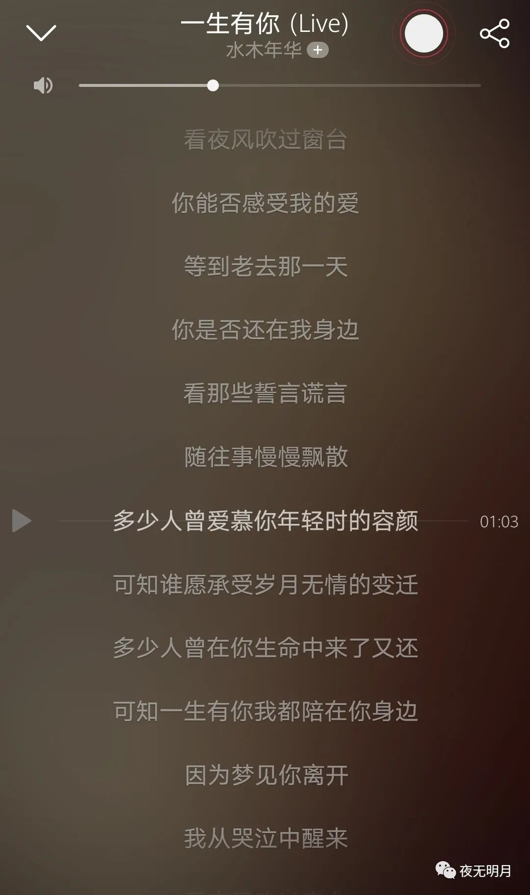 《一生有你》歌词中触动我弱小心灵的是:多少人曾爱慕你年轻时的容颜,可知谁愿承受岁月无情的变迁。无法用语言来表达沉入其中的那种伤感,是一种无奈的伤感,是一种无能为力的伤感。望着她消失的背影和迎面走来的面容,是一种独自现在山顶望着远处的云飘走的伤感。时间于我只是存寄短暂记忆的空壳,翻过来,翻过去,空空如也。盼望一个突然突然出现的你,一转眼却又不见。