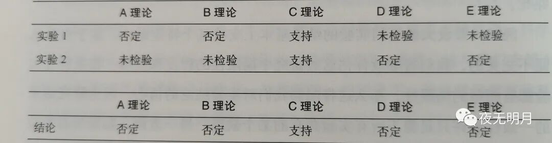 那如何来判断补中益气汤是否有用呢,这就需要用到一个原则:聚合性操作原则。每个实验都有助于纠正其他实验在设计方面的偏差,当大量实验的证据指向类似的方向时,实验证据就有了聚合性。尽管没有一个实验的设计是完美的,我们还是可以得出一个相当有力的结论。因此,聚合性证据原则要求我们将结论建立在大量略有差异的实验所得的数据之上。这个原则让我们能够得出更强的结论,因为在这种情况下获得的一致性不太可能是由某个特殊的实验程序所造成的。聚合性证据原则也可以从理论检验的角度加以表述。当一系列实验一致支持某个理论,同时又共同地排除那些最重要的竞争理论时,研究就具有高度的聚合性。尽管没有单一的实验能排除所有的替代解释,但是将一系列能排除一部分替代解释的实验汇总起来,如果数据模式都呈现出某种特定趋势就能产生一个强有力的结论。例如,假设针对某一现象,同时存在五种不同的理论解释(称它们为A、 B、C、D和E),现在用一系列的实验来加以检验。假设有一个效力很强的实验检验了A、B和C理论,结果数据基本上否定了A和B理论,支持了C理论。再假设另一个效力特别强的实验检验了C、D和E理论,结果数据基本上否定了D和E理论,支持了C理论。在这种情况下,我们就有了支持C理论的强有力的聚合性证据。我们不仅有支持C理论的数据,还有反驳其他竞争理论的数据。请注意,没有任何一个实验能够检验所有的理论,但是一系列实验汇总起来就能得出有力的推论。这一情况可以用下面的表格来表示: