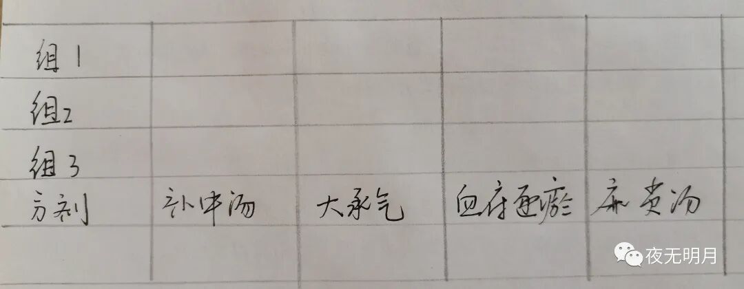 这三组当中再分为补中益气汤组、大承气汤组、血府逐瘀汤组和麻黄汤组。同样喂养条件下,以一个月为时间,最后判断大鼠肠炎愈合情况,可以测定炎症指标或解剖大鼠大肠病理判定。这样就会得到每一组中每个方剂是否有效。如果1组中的补中益气汤有效,而其他组无效,则说明补中益气汤对中气不足证有用。