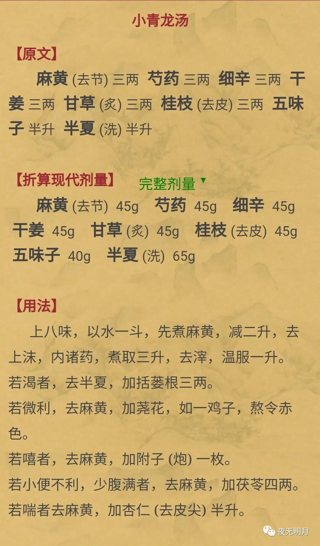 根据患者病情变化及时加减调整用药也很必要,不能小青龙汤原方一磕到底,其变化调整以及善后也很必要。