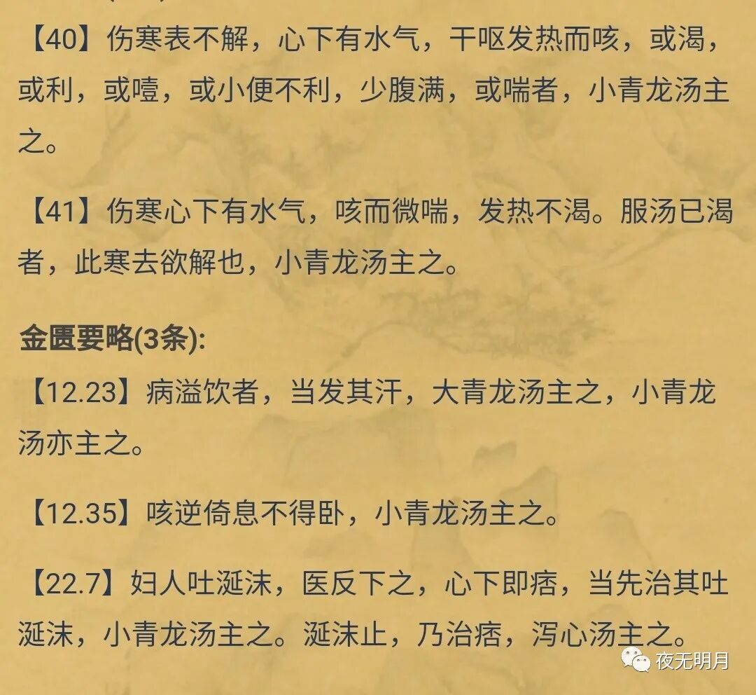 那如何独取小青龙汤呢?当时用小青龙汤时只想了一个点:你管病人咳嗽了多久,你别看他咳嗽半年,就算咳嗽几年,也依然可能存在表证。回想一下,太阳病,脉浮,头项强痛而恶寒。虽然该病人没有头项强痛症状,脉也不符合,但别忘了人体不仅仅有太阳经络之表,还有人体皮肤之表,故判断病人还在太阳证阶段。看一下小青龙汤的条文:
