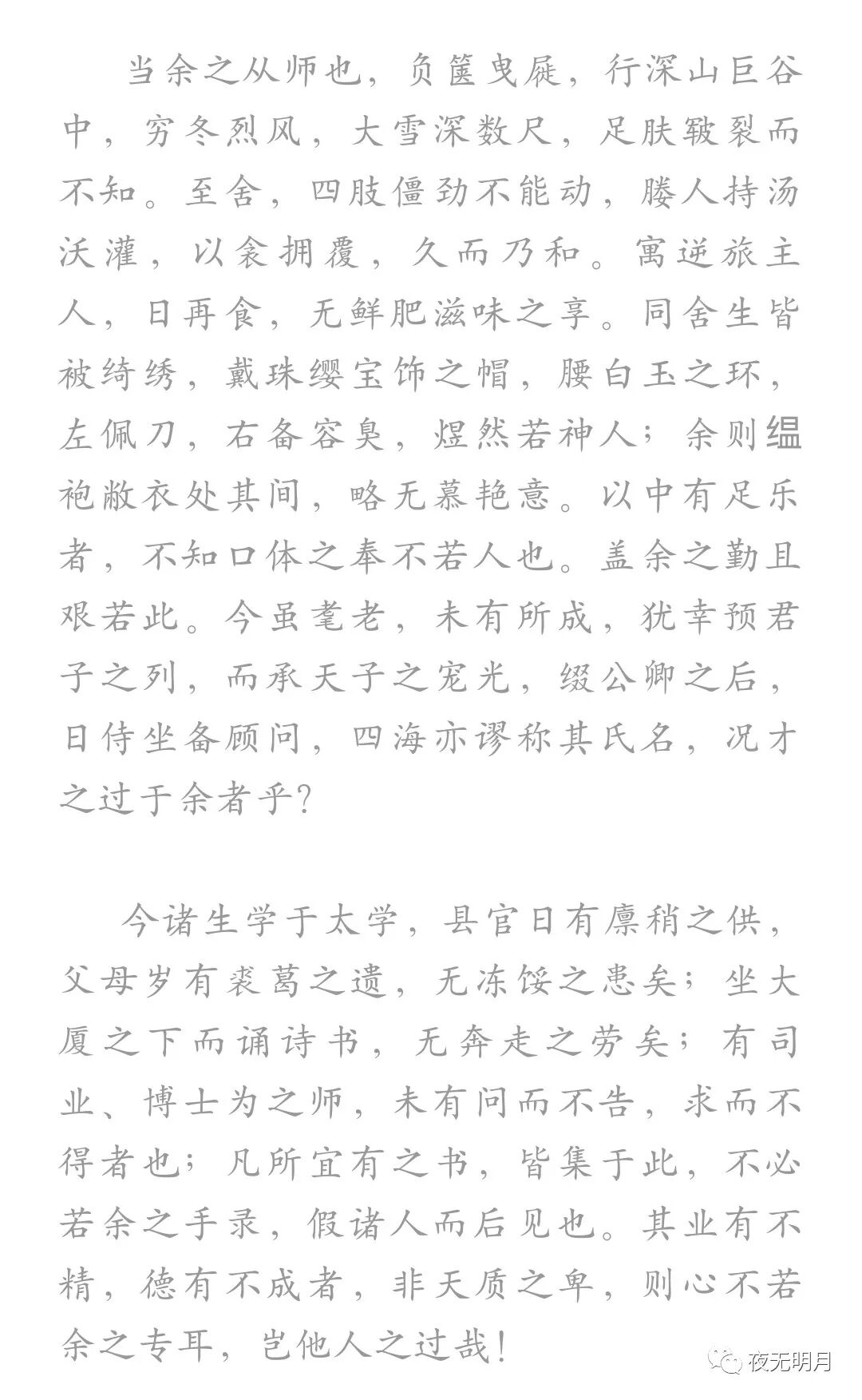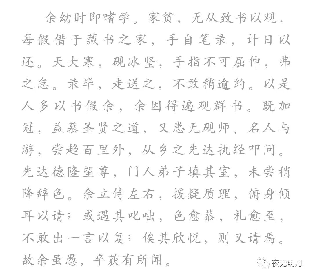 文中一句“家贫,无从致书以观”,足以从基础条件就否定达到成就不一定要靠物质条件。从那以后我不再认为基础条件是决定改变自我的必有条件。