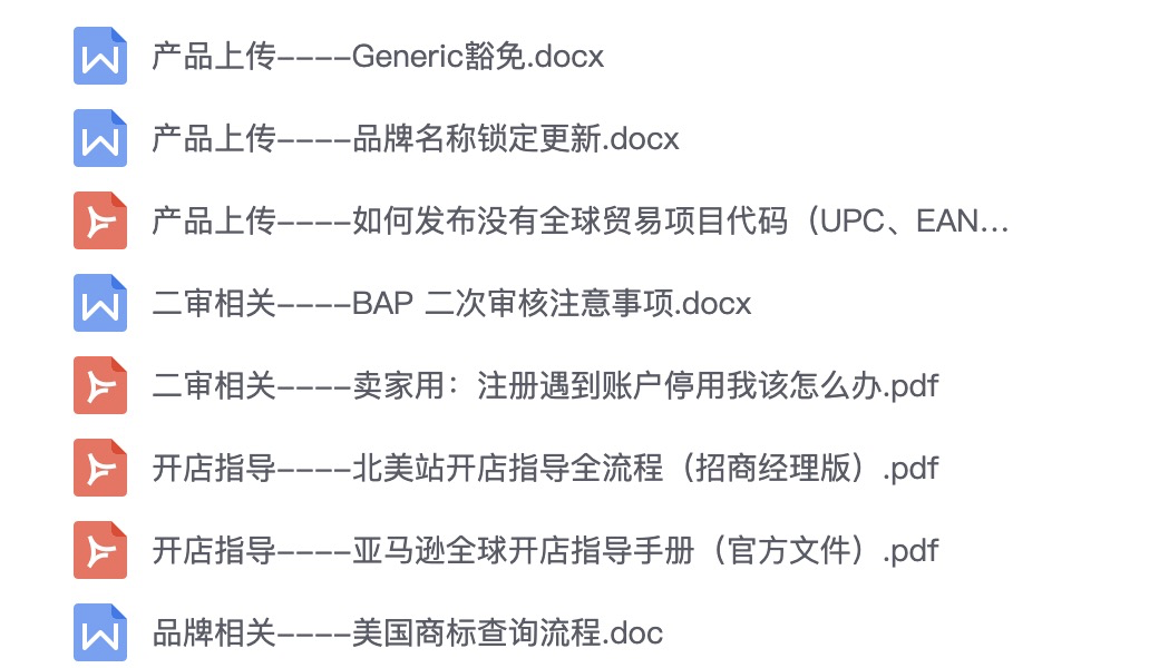 最后再来一波福利,在生财有术公众号后台回复 “亚马逊开店文件包” ,即可获得以下 8 个开店、二审、产品上传、美标查询的操作资料哈。