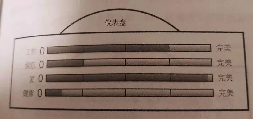 《人生设计课》提出了一个可以评估当前状况的方法,叫做“健康/工作/娱乐/爱”仪表盘,可以先从健康、工作、娱乐和爱这四方面来评估一下自己的现状。