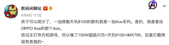 关于具体的产品定位,博主@数码闲聊站 曾在此前的爆料中提到过,全新的一加Ace系列与此前的OPPO Ace系列定位接近,主打快充和游戏。因此,这款新机将会在搭载天玑8100的同时,支持150W超级闪充,还配备了IMX766传感器。