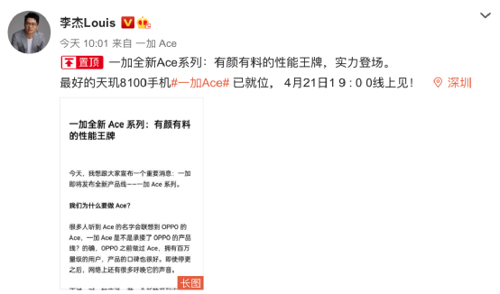 4月14日,一加手机正式官宣,“王牌登场,快稳狠!性能王牌一加Ace新品官宣!线上发布会时间:4月21日19:00”。一加将要推出的Ace系列新机,是一个新的产品系列。
