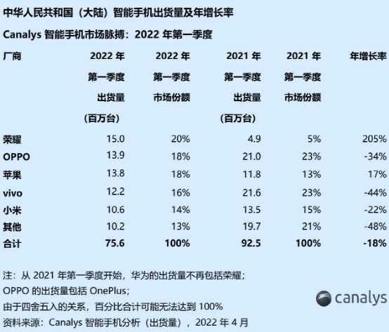 根据知名市场调研机构Canalys的数据报告,2022年第一季度中国手机销量排名中,小米手机仅排在第五,而vivo从曾经的第一直接滑落到了第四的位置,苹果手机排在第三位,第一名让人多少有点意外。