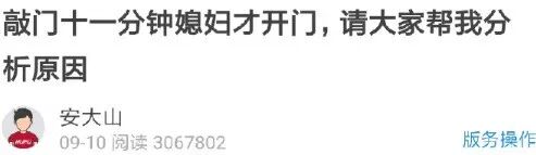就在安大山准备放弃找地儿呆会的时候,媳妇在9点12分回电话,问他在哪儿。安大山回说自己在家门口,媳妇马上就过来开门了。