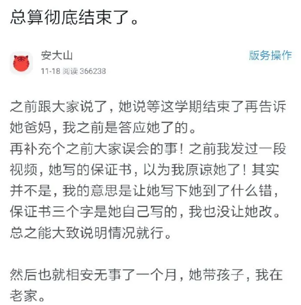在后续的更新中,安大山表示媳妇已经承认自己出轨,出轨对象是一个27岁的男青年。