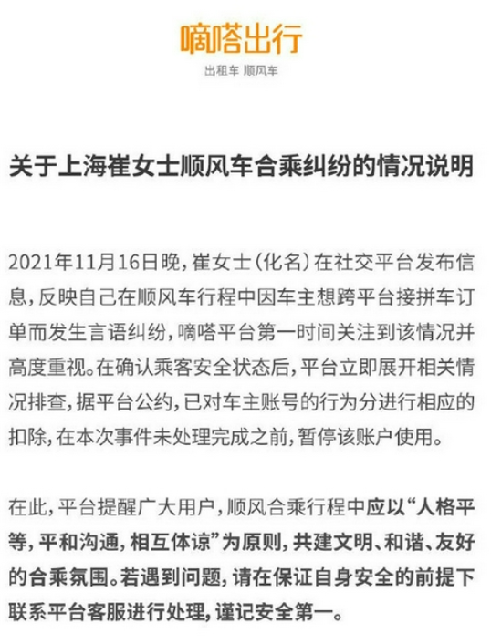 近日,针对女乘客与司机言语纠纷事件,嘀嗒出行在微博上回应称,已对车主账号进行扣分及暂停接单处置,后续将根据客诉处理进展及时更新。