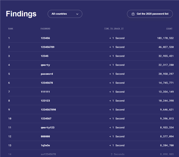 今天,密码管理软件 NordPass 公布了 2021 年最常用密码榜单,前几个最常用的密码不用猜都知道是哪些了,今年位列第一的依然是 123456,它以 1.03 亿的“优秀成绩”遥遥领先其他密码成为当之无愧的第一。